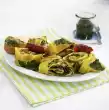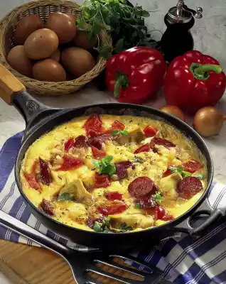 Cut the sausage into thin slices. Drain artichokes on a sieve and cut them into halves or quarters. Peel and finely chop the onion. Clean, wash and cut the bell peppers into small pieces