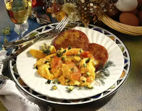 Place the potato pancakes on a baking tray and bake in a preheated oven (electric range: 200 °C/ gas: level 3) for approx. 5 minutes on each side until golden brown. Clean, wash and cut the zucchini into small cubes. Cut salmon into strips. Whisk eggs and milk, season with some salt and pepper. Fry the zucchini cubes in hot oil.