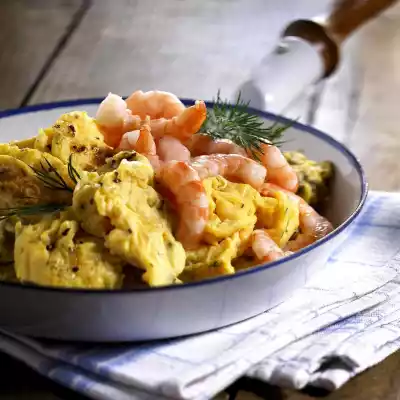 Add egg milk and sprinkle with dill. Leave to stand over medium heat. Push the egg mass together several times. Remove from the heat and add the shrimps. Garnish with the remaining dill flags.