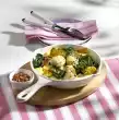 Bring to the boil and allow the stock to reduce by half. Dice well chilled butter and stir into the spinach. Season to taste with salt, pepper, nutmeg and vinegar. Keep warm. Wash the fish fillets, dab dry and season the meat side with salt and pepper.