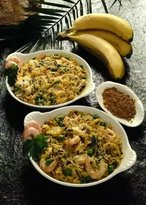Put rice in 1/2 litre of boiling salted water and cook covered over low heat for about 20 minutes. Grate cheese. Wash fish briefly, dab dry and cut into 2 cm wide pieces. Sprinkle fish pieces and crabs with the juice of 1/2 lemon. Peel and slice bananas and sprinkle with the remaining lemon juice.