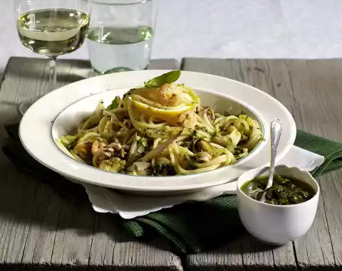 Season with salt, pepper, lemon juice and pesto. Cook the pasta in boiling salted water according to the instructions on the packet. Take off 100 ml of pasta boiling water. Mix pasta, pasta water and seafood and arrange on plates.