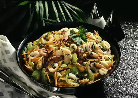 Put the octopus and calamari in a sieve and let them cool down. Meanwhile clean and wash the celery and carrots. Cut celery into thin slices and carrots into fine sticks. Wash parsley, dab dry and cut into fine strips, except for something to garnish.