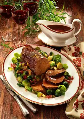 Turn the roast from time to time and gradually add the rest of the wine and stock. During the last hour of cooking, clean and wash the Brussels sprouts and cut the stalk in a cross shape. This will make the cabbage cook more evenly.