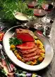 Heat the fat. Heat drained beans, mushrooms and bacon in it while swivelling. Arrange roast, vegetables and some sauce on a plate. Garnish with remaining rosemary and parsley. Remaining sauce extra is enough.
