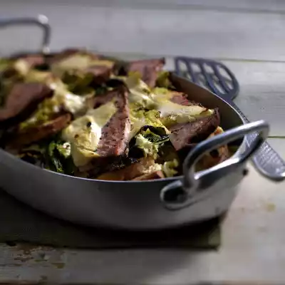 Heat the fat, add the onion and savoy cabbage, pour on the stock and stew in a closed pot for about 5 minutes. Halve the meat loaf and cut into 16 slices. Place one after the other in 2 layers of bread, savoy cabbage and meat loaf in the greased form (approx. 2 litres capacity). Spread half the sour cream on each. Bake in the preheated oven (electric cooker: 175 °C/ convection oven: 150 °C/ gas: level 2) for approx. 20 minutes