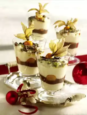 Caramelise 1 tablespoon of sugar in a pan. Add the pistachios and stir for about 1 minute. Put the nuts from the pan on a piece of aluminium foil, let them cool down and chop them roughly. Whip 75 g cream until stiff and fold into the semolina. Fill semolina cream, nougat cream and physalis alternately into 4 glasses and sprinkle with pistachio brittle. Decorate dessert with amarettini and physalis