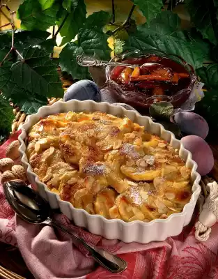 Cut the dumplings into slices about 1 cm thick. Layer in a flat greased casserole dish (1 l capacity). Spread marzipan, flaked almonds and 1 tbsp. fat in flakes on top. Bake in a hot oven (electric cooker: 200 °C / convection oven 175 °C / gas: level 3) for about 35 minutes. Dust with icing sugar. Plum compote tastes good with it