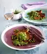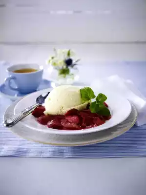 Clean and wash the rhubarb, halve it lengthwise and cut into small cubes. Mix starch with 2 tablespoons of water. Melt 1 tablespoon butter in a pot and add 75 g sugar. Deglaze with orange juice, add rhubarb and simmer for about 1 minute. Stir in the starch and bring to the boil again while stirring constantly. Put the compote into a bowl and let it cool down. Arrange compote on 4 plates. With the help of a damp tablespoon, form 4 large dumplings from the semolina porridge and place 1 dumpling each on the compote. Decorate with mint