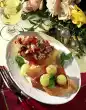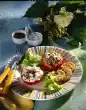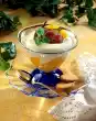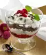 Stir in the starch and let it simmer for about 1 minute while stirring. Let it cool down. For decoration, melt 3 tablespoons of sugar in a flat pan to a golden yellow caramel. Using a fork, draw thin lines of caramel criss-cross on an oiled piece of aluminium foil. Leave to cool and break into pieces. Cut off the mousse with a tablespoon of cam dipped in hot water. Serve with cherry compote. Decorate with caramel and balm