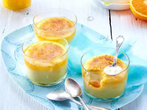 Fill semolina pudding into fireproof glasses (approx. 200 ml each), smooth it down. Sprinkle with brown sugar and caramelise with a crème-brûlée distiller.
