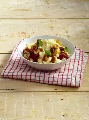 cream. Stir into the semolina porridge. Fold in the beaten egg white. Fill semolina into 4 bowls. Spread apples over the semolina, add sauce. Decorate with nuts and mint