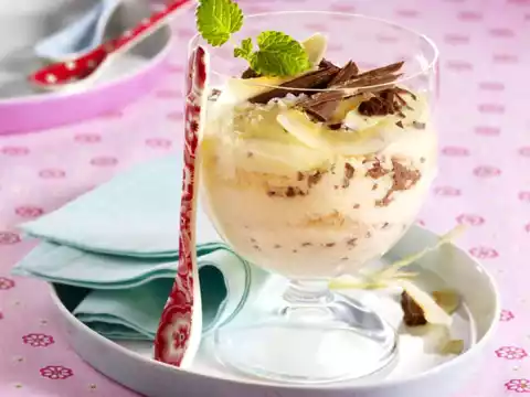 Fold in the beaten egg white. Layer semolina with coconut scrapings and chocolate in 4 glasses. Decorate with melissa and coconut chips and serve immediately.