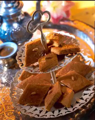 Put semolina in a bowl. Add butter, baking powder, cinnamon, salt and 1 tablespoon lemon juice and knead. Knead the yoghurt. Put the dough on a baking tray lined with baking paper and smooth it down. Use a sharp knife to mark diamonds of approx. 5x5 cm. Press a pine nut into the middle of each diamond.