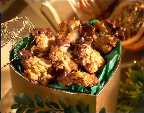 Coarsely chop the chocolate coating and melt in a hot water bath. Dip Florentines with one corner each into the chocolate. Allow to dry