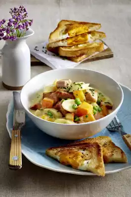 Wash the chives, shake dry and cut the stalks into small rolls. Add approx. 2/3 of the chives, vegetables and cured pork loin to the sauce and warm it up. Cut a circle (6-7 cm Ø) out of the toast.