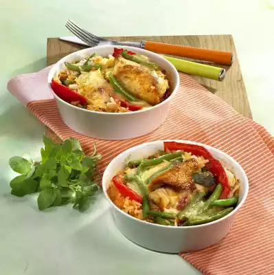 Heat oil. Fry the rolls for 5 minutes. Add paprika and fry for 2 minutes. Add aiwar, deglaze with broth and cook for about 2 minutes. Mix beans and rice. Put everything into ramekins. Cut mozzarella into thin slices and spread on top. Bake in the preheated oven (electric cooker: 200 °C/ convection oven: 175 °C/ gas: level 3) for about 15 minutes