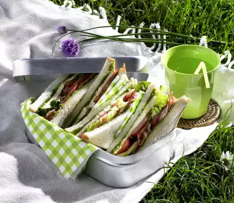 Cover 2 slices with mozzarella, tomato, salad and ham. Finish with the remaining slices. Cut the breads diagonally in half and pack them in a tin to keep them fresh.