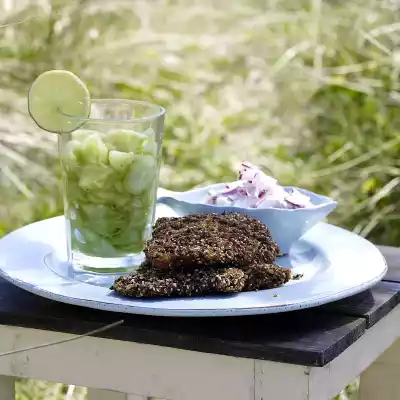 Cucumber salad in Caipirinha glasses distribute. Cut lime slices to the middle, stick them to the edges of the glass. Serve with schnitzels and radish cream.