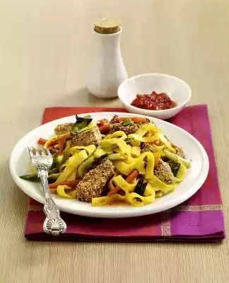Wash the meat, dab dry and cut into finger-thick strips. Prepare pasta in boiling salted water according to package instructions. Place the wok vegetables in a pan with 2 tablespoons of water and steam over a medium heat for approx. 5 minutes, stirring continuously. Drain the noodles, add to the vegetables with the chilli sauce and toss. Heat the oil in another coated pan.
