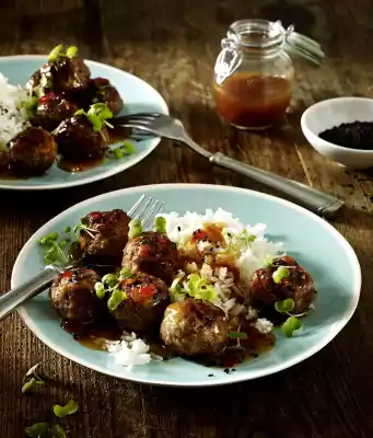 Cook rice according to package instructions. Heat oil in a large pan and fry meatballs for 7-8 minutes, turning them over. Deglaze frying pan with stock and chilli sauce. Bring to the boil and simmer for 1-2 minutes.