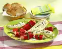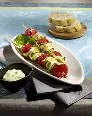 Zucchini washing, cleaning. Peel thin slices lengthwise with a peeler. Wash the tomatoes. Clean and shine the mushrooms. Put the vegetables alternately on 2 skewers, while skewering the zucchini in a wavy shape.