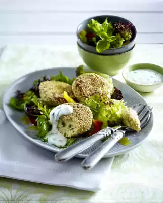 Shape 16-20 small thalers from the soya mass with moistened hands, turn in sesame. Heat 6-8 tablespoons of oil in portions in a coated pan. Fry the thalers for 4-5 minutes on each side, keeping the finished thalers warm.