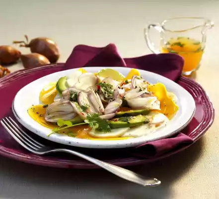 Peel the mango, cut the flesh off the stone. Cut avocado in half, stone and peel. Cut mango and avocado into slices and sprinkle with lemon juice