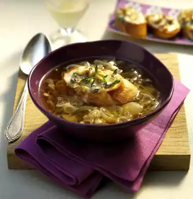 Take out. Turn bread slices and sprinkle with gorgonzola and nuts. Place under the grill again for about 1 minute. Season shallots soup with salt and pepper and serve in deep bowls. Place 1 gorgonzola baguette on each soup and serve immediately. Serve the rest of the baguette slices separately