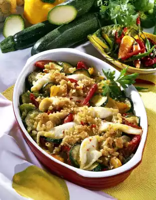 Put the vegetables in a greased baking dish and spread the marinated plaice fillets on top. Pour over the egg and sprinkle with white bread and butter in flakes. Bake in the preheated oven (electric oven: 200 °C/ gas: level 3) for 25-30 minutes.