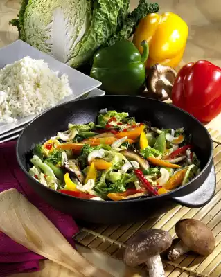 Clean and wash the peppers and mushrooms and cut them into fine strips. Clean savoy cabbage, cut into slices, remove stalk. Wash cabbage and cut into strips. Prepare rice in boiling salted water according to instructions on the packet.