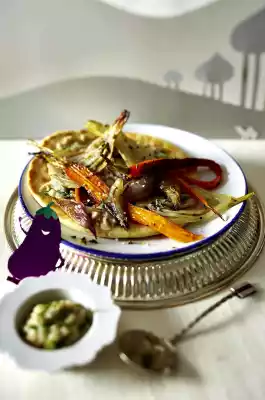 After about 20 minutes add the aubergine to the tray and continue cooking.