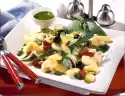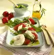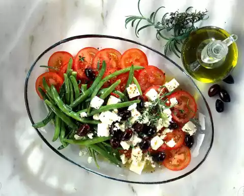Clean, wash and possibly halve the beans. Cook in boiling salted water for about 15 minutes. Wash, clean and slice the tomatoes. Dice cheese. Quench beans cold and drain.