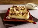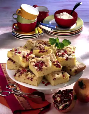 Then drain the pomegranate seeds on kitchen paper. Cream 250 g butter, 175 g sugar, salt and vanilla sugar with the whisk of the hand mixer. Stir in the eggs one after the other. Mix flour, baking powder and ground almonds, add alternately with 75 ml milk and stir in. Pour the dough evenly onto a greased fat pan of the oven (32 x 39 cm, 3-3.5 cm deep) and distribute evenly. Pour the pudding onto the dough in patches with a tablespoon. Sprinkle pomegranate seeds on top and sprinkle with 50 g sugar and flaked almonds. Bake in the preheated oven (electric oven: 200 °C/ gas: level 2) for 35-40 minutes. After half of the baking time, spread 50 g butter in small flakes over the cake and bake until the end. Remove from the oven, place on a rack and allow to cool.