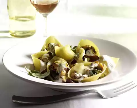 Add porcini mushrooms, sage, onion and garlic and continue to fry for about 3 minutes. In the meantime chop the walnuts roughly. Remove the pan from the heat, fold in the walnuts and 2 tablespoons of ricotta, season with salt and pepper.