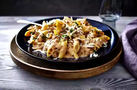 Cook the pasta in boiling salted water according to the instructions on the packet. Add tomato paste to the minced meat and sauté briefly. Dust with flour and sauté. Add cream and 200 ml pasta cooking water and bring to the boil.