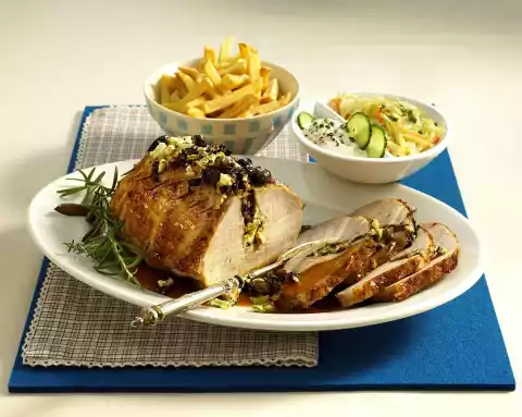 Arrange the tzaziki with the rest of the chives and cucumber slices. Remove the roast and keep it warm. Pour stock through a sieve into a pot and bring to the boil, thicken with sauce thickener. Season sauce with salt and pepper. Carefully remove kitchen string from the roast, cut the roast open and arrange on a plate with herbs and some sauce. Cabbage salad and Tzaziki extra are enough. French fries taste good with it