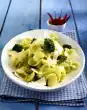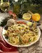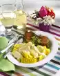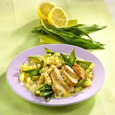 Remove the flesh from the skin, cut into pieces and sprinkle with 2 tablespoons of lemon juice. Drain the pasta and let it drain. Season the sauce with the remaining lemon juice, sugar, salt and pepper. Clean, wash and pat dry the wild garlic. Cut the chicken fillets into slices. Arrange pasta, meat, sauce, avocado and wild garlic on plates. Sprinkle with lemon peel.