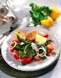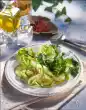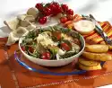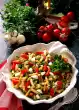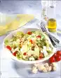 Add oil drop by drop. Mix in the onion cubes. Mix the pasta, cheese and peppers with the vinaigrette and marinate for about 10 minutes. In the meantime clean and wash the salad, pluck it into pieces and fold it in. Season again with salt and pepper and arrange on plates