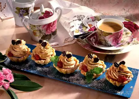 Spread the coffee through a sieve onto the cream, add the remaining vanillin sugar and beat until stiff. Pour into a piping bag with a large star-shaped spout and squirt onto the tartlets. Dust with cocoa and icing sugar.
