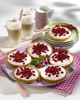 As soon as the yoghurt starts to gel, fold in the cream. Lift the cakelets out of the moulds. Spread the yoghurt and cream mixture over the cakelets and chill for approx. 30 minutes. In the meantime, moisten 3 redcurrant panicles and turn them over in 3 tablespoons of sugar, set aside. Spread the rest of the redcurrants on the tartlets. Arrange the tartlets on a plate and decorate with the sugared redcurrant panicles and lemon balm