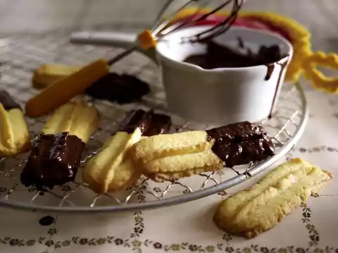 Chop the chocolate coating and melt it with coconut oil in a hot water bath. Dip the biscuits halfway into the chocolate coating and let them drip off. Leave to dry.