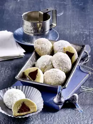 Wrap the dough from the foil and divide it into 2 equal pieces. Form dough pieces into a roll, divide each roll into approx. 8 pieces of the same size and form into balls. Press the balls flat, place a chocolate drop on each ball.