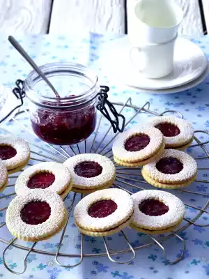 Spread circles with jam, leaving 2-3 mm of edge free. Dust the rings with icing sugar and place them on the jam.