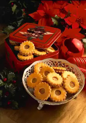 Roll out the short pastry thinly on a floured work surface and cut out approx. 50 cookies of approx. 5 cm Ø. Make a hole in half of the biscuits with a small cookie cutter (2 cm Ø).