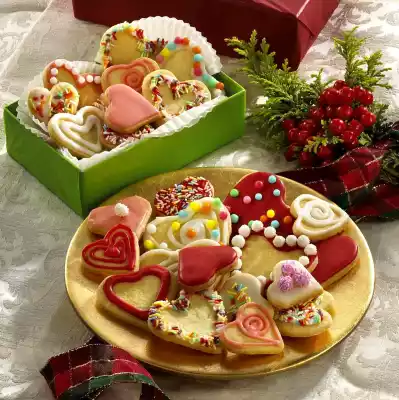 Bake one after the other in a preheated oven (electric cooker: 200 °C/ convection oven: 175 °C/ gas: level 3) for approx. 10 minutes. Let it cool down on a cake rack. Process the remaining dough in the same way. Sift icing sugar and mix with lemon juice. Colour 1/4 icing pink, 1/4 icing red. Pour each glaze into a freezer bag, cut off a small corner. Decorate the hearts as you like with icing, pearls and crumbles