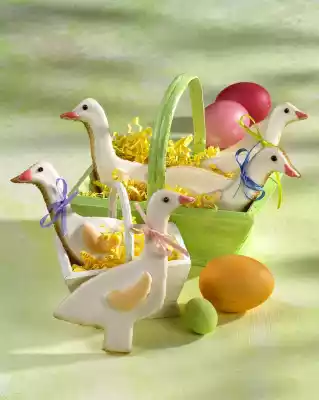 In the meantime, mix lemon juice and icing sugar. Remove 1/3 of the icing and colour it orange with a few drops of food colouring. Cover the geese with the white icing. Cover wings with orange icing and place one wing on each goose body.