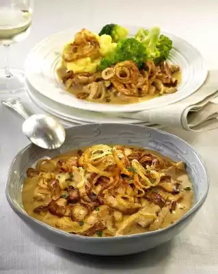 Brown the meat in it in portions and take it out. Add 2 tablespoons of oil to the frying fat. Fry the onions in it until golden brown and take them out. Put the meat and 3/4 of the onions back into the pan. Deglaze with 3/8 litres of water and cream and bring to the boil. Let simmer for about 5 minutes. Cook broccoli in salted water for about 5 minutes. Drain the potatoes. Add milk and fat and mash to puree. Stir mustard into the sauce and season with salt, pepper and thyme. Drain broccoli. Arrange the shredded potatoes with mashed potatoes and broccoli on plates.