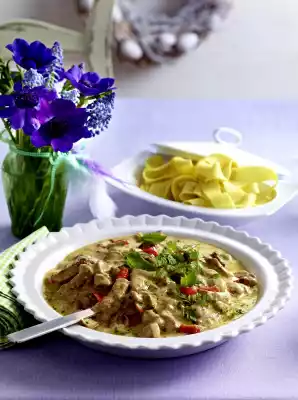 Ribbon noodles taste good with it.