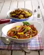 Heat the remaining oil. Brown the meat in it in 2-3 portions. Season with salt and pepper. Put all the meat, mushrooms, onions and peppers in the roaster. Dust with flour and sauté briefly.